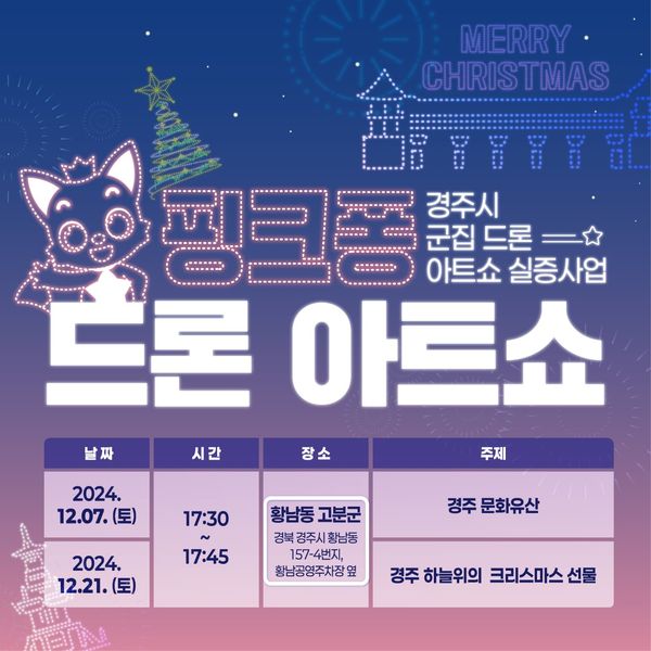 경주시 군집 드론 아트쇼 12월 일정 ★ 날짜 및 시간 : 12월 7일(토), 12월 21일(토) 17시30분 ★ 공연장소 : 황남동 고분군 ★ 공연주제 : 경주 문화유산, 크리스마스 ※ 핑크퐁 캐릭터를 활용한 드론 콘텐츠 포함 . .