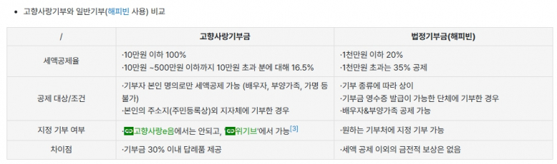 | 고향사랑기부제와 일반기부와 요점 비교 |