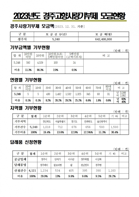 243개 지자체중 담양군이 22억4천만원으로 전국 1위를 차지했으며, 경주시는 지난해 5,248명에게서 642,408,000원을 모금했다. 기부금액별은 10만원 기부자가 전체 기부자들 중 86.3%에 달하고, 500만원 고액기부자는 0.5%에 지나지 않으며, 기부자 중 29.2%가 40대이다 여기서 남녀 비율은 남성이 60%를 차지 하고 지역별 비율은 경북권 19.4%로 가장 높은 것으로 조사되었다.