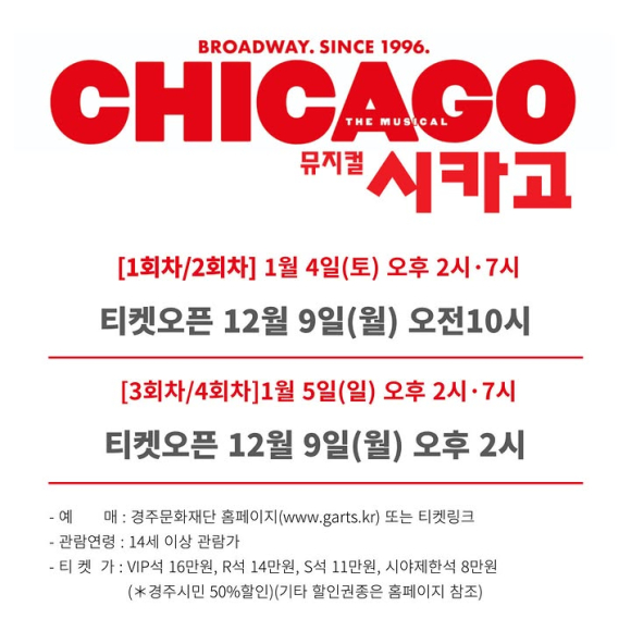 ✔티 켓 가 : VIP석 16만원, R석 14만원, S석 11만원, 시야제한석 8만원(*경주시민 50%할인)