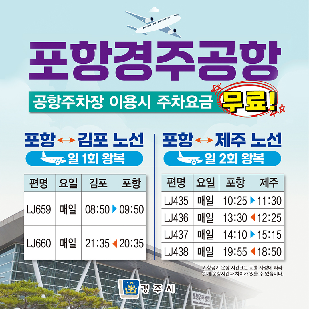 포항경주공항 운항시간표 안내해 드립니다! 포항경주공항 공항주차장 이용시 주차요금이 무료입니다. 시민 여러분들의 많은 이용 바랍니다! 자세한 시간표는 카드뉴스를 통해 확인해 주세요!