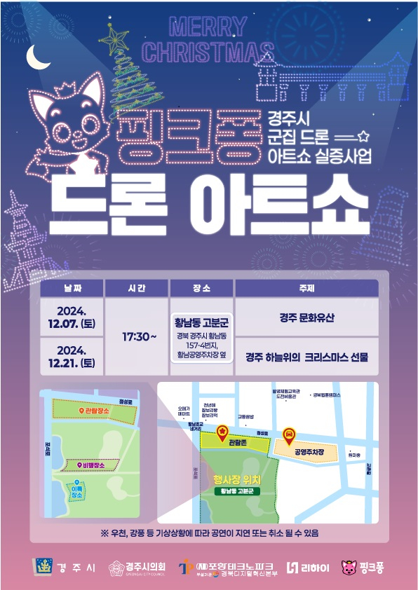 ‘경주의 문화유산과 크리스마스 드론 아트쇼’라는 제목으로 열리는 이번 드론쇼는 이틀 모두 오후 5시 30분부터 시작된다.