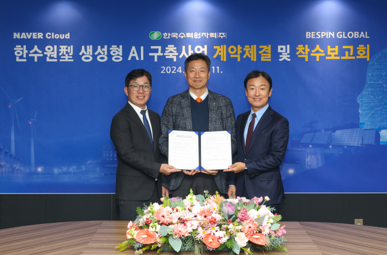 [이재영 기자] 한국수력원자력(사장 황주호, 이하, 한수원)이 11일 네이버클라우드(대표 김유원), 베스핀글로벌(대표 장인수)과 서울 한수원 방사선보건원에서 ‘한수원型(형) 생성형 AI 구축 사업’ 계약을 체결하고 인공지능 구축 사업에 착수했다.