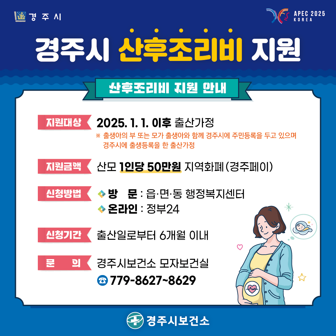 경주시 산후조리비 지원 안내 ○ 지원대상 : 2025. 1. 1. 이후 출산가정 ○ 지원금액 : 산모 1인당 50만원(경주페이) ○ 신청방법 : 읍면동 행정복지센터 방문 또는 정부24에서 신청 ○ 신청기간 : 출산일로부터 6개월 이내 ○ 문의 : 경주시 보건소 모자보건실(054-779-8627~8629) . .