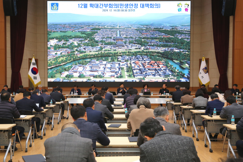 | 주낙영 경주시장이 16일 청내 알천홀에서 최근 혼란한 정국 속 지역 경제 안정과 활성화를 위해 긴급 민생안정 종합대책 회의를 주재하고 있다. |