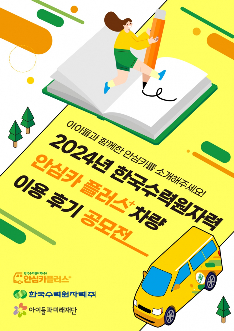[이재영 기자] 한국수력원자력(사장 황주호, 이하 한수원)이 ‘안심카 플러스’사업을 지원받은 전국의 지역아동센터, 아동복지시설 등을 대상으로 안심카 활용 후기 수기 공모전을 개최한다.