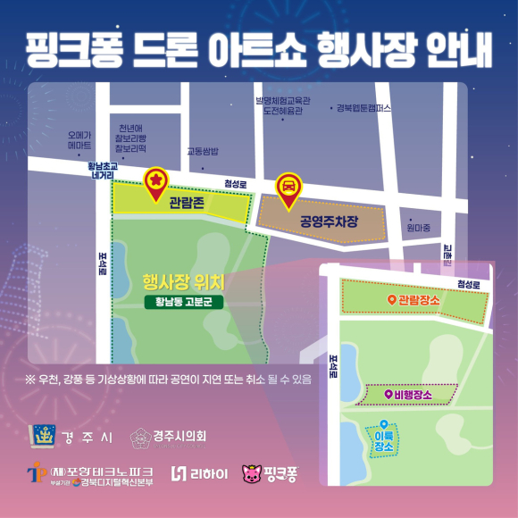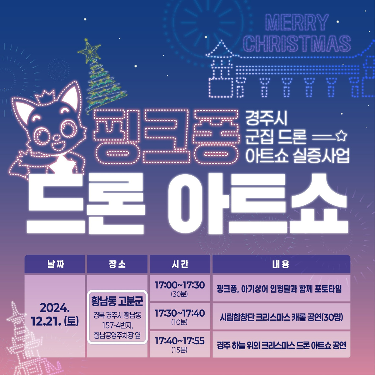 경주시 군집 드론 아트쇼 ● 날짜 및 시간 : 12월 21일(토) 17시부터 ※ 핑크퐁, 아기상어와 함께 사진찍기, 캐롤합창공연 ● 공연장소 : 황남동 고분군 ● 공연주제 : 경주 하늘 위의 크리스마스 드론 아트쇼 ※ 산타모자, 루돌프 뿔을 단 핑크퐁, 아기상어 콘텐츠 . .