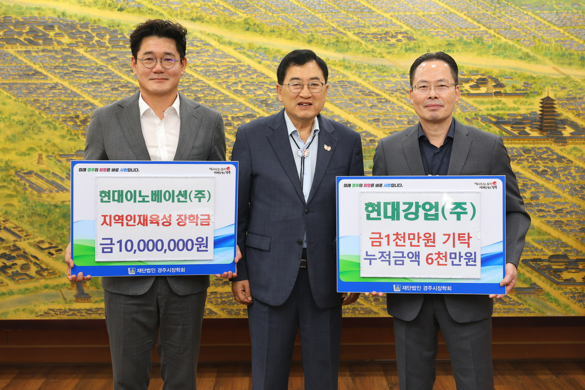 현대강업(주)(회장 이상춘)과 자회사 현대이노베이션(주)(대표 양희성)은 30일 지역 인재 육성과 교육 발전을 위해 각각 1,000만 원씩, 총 2,000만 원의 장학금을 (재)경주시장학회에 기탁했다.