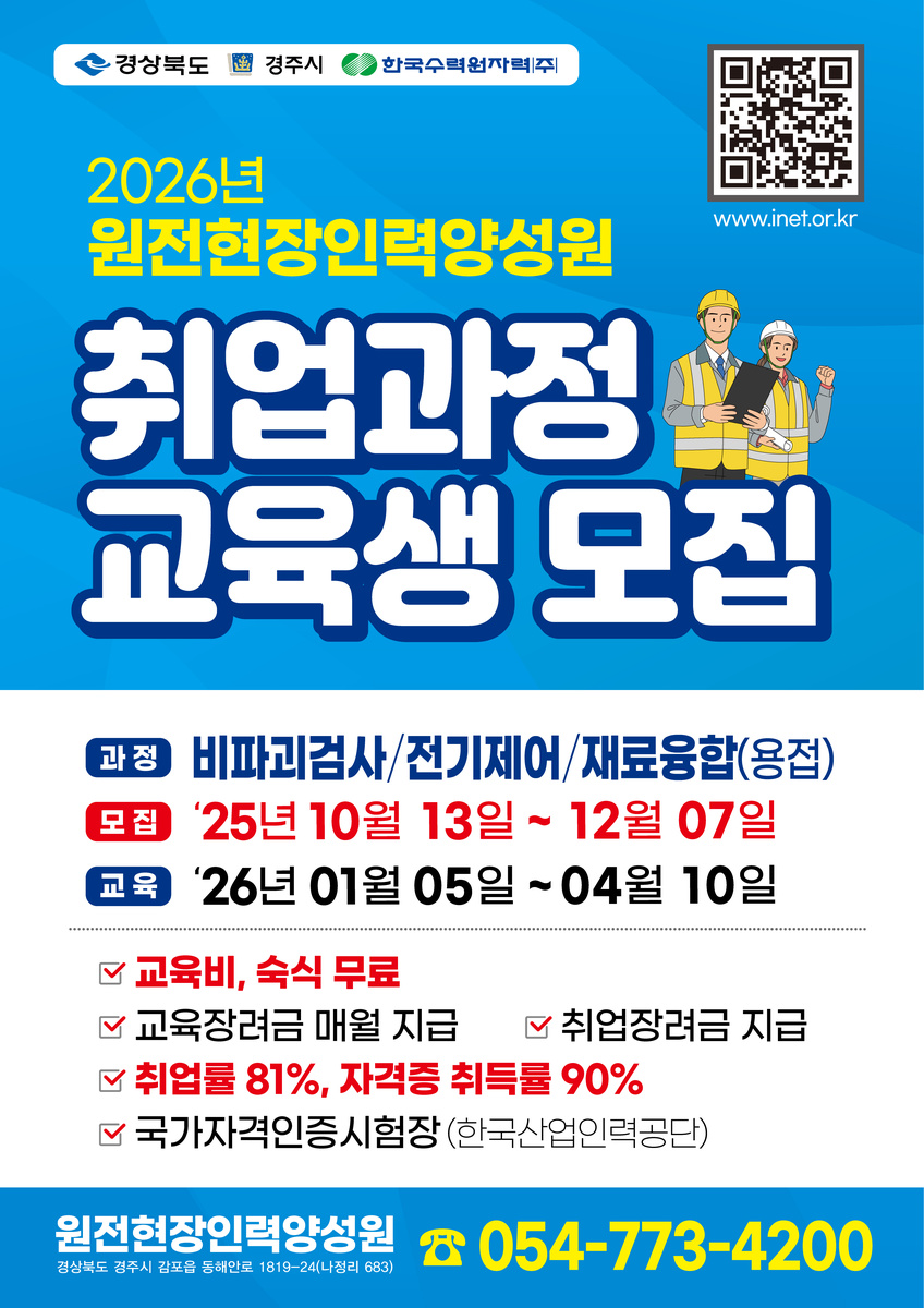 원전 및 전력산업 현장기술인력 양성을 위해 설립된 (재)원전현장인력양성원 (원장 이인식, 이하 양성원)은 13일부터 12월 7일까지 2026년 제15기 취업과정 교육생을 모집 ‧ 선발하고 있다.