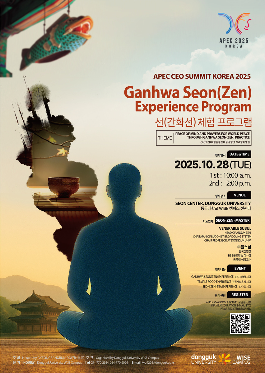 동국대학교 WISE캠퍼스(총장 류완하)가 오는 28일 ‘APEC 2025 KOREA’ 기간 중 참가국의 CEO 및 관계자를 대상으로 선(간화선) 체험 프로그램 ‘Ganhwa Seon(zen) Experience Program’을 개최한다고 밝혔다.