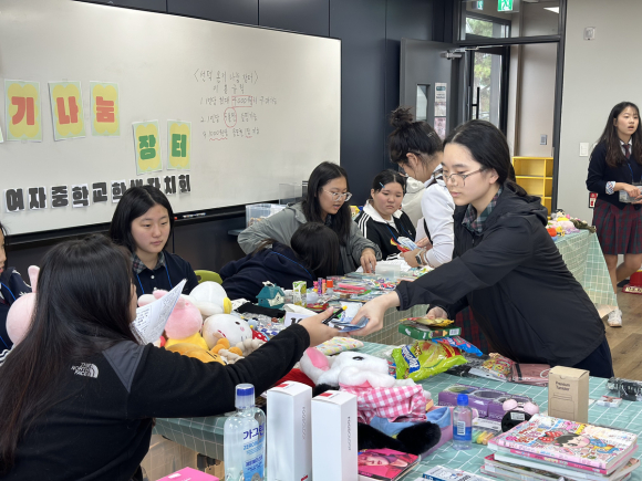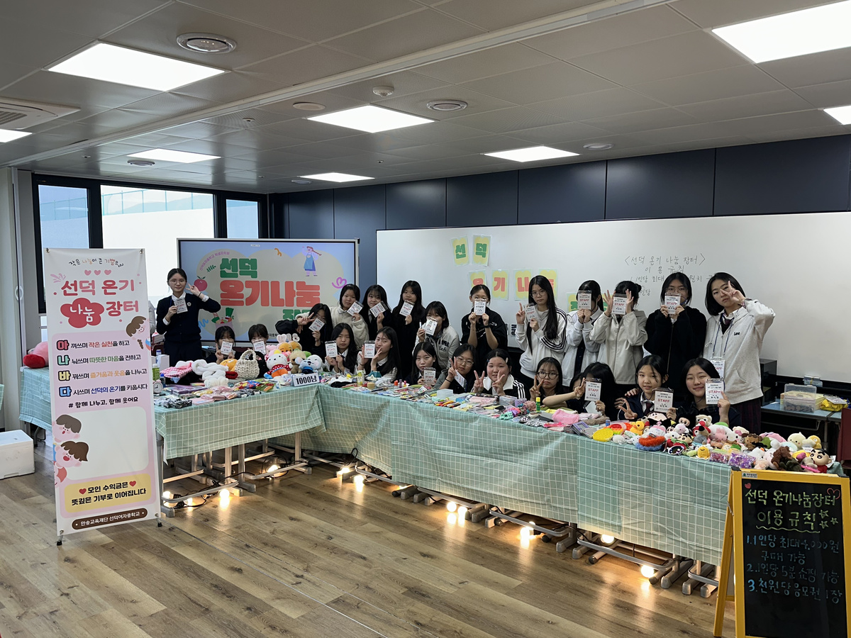 선덕여자중학교(교장 강환수)는 지난 24일 점심시간 확대 운영을 통해 학생자치회와 리틀농부 동아리가 함께 준비한 ‘선덕 온기나눔 장터’를 성황리에 개최했다. 자원 순환과 경제 관념을 익히고 나눔 공동체의 가치를 실현하기 위해 시작된 본 행사는 ‘아나바다(아껴 쓰고, 나눠 쓰고, 바꿔 쓰고, 다시 쓰기)’정신을 실천하고, 나눔과 배려의 가치를 몸소 체험할 수 있는 뜻깊은 시간이 되었다.