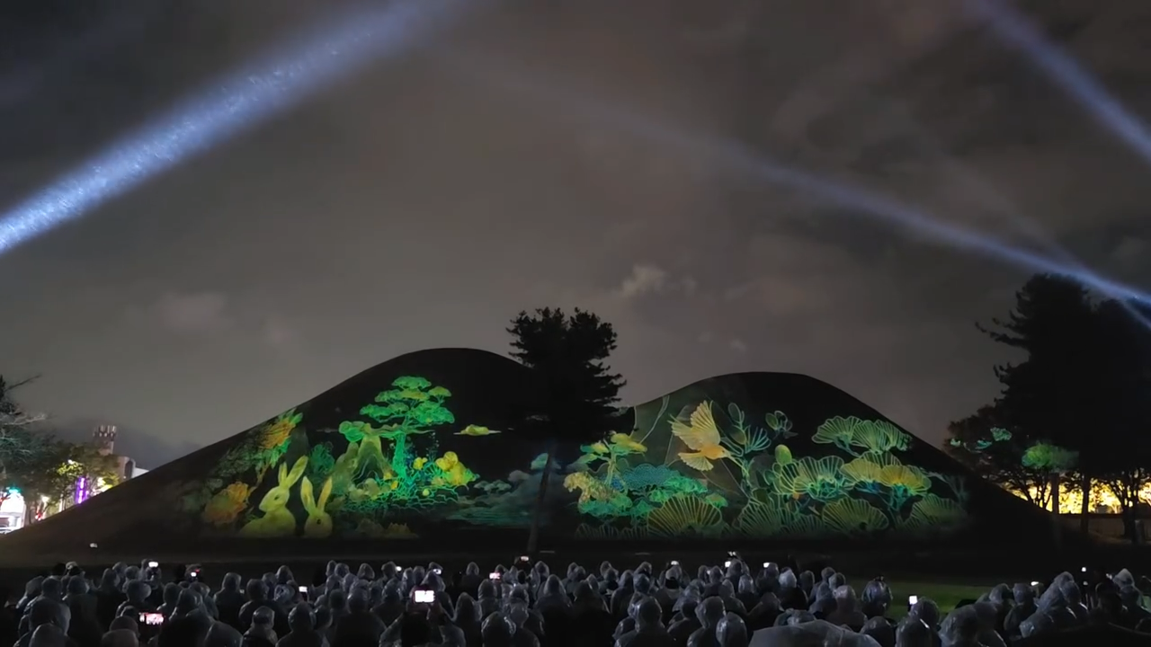 대릉원 고분군 곳곳에 설치된 미디어파사드와 LED 조명, 모션캡처, AI 인터랙티브 기술을 통해 고대 신라의 왕릉이 빛과 예술로 되살아나는 환상적인 장면이 연출된다.