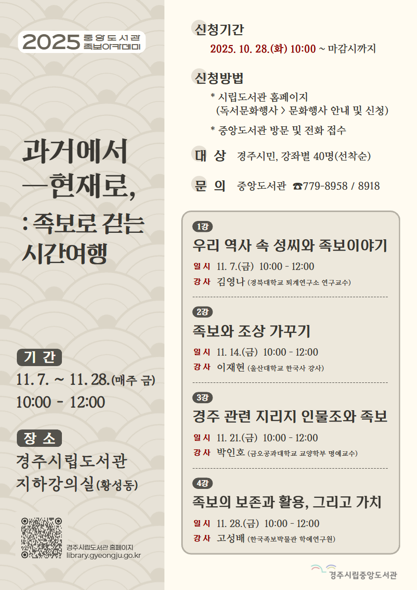 경주시립중앙도서관은 오는 7일부터 12월 5일까지 매주 금요일 오전 10시, 경주시립도서관 지하 강의실에서 ‘2025 족보아카데미 : 과거에서 현재로, 족보로 걷는 시간여행’을 운영한다.