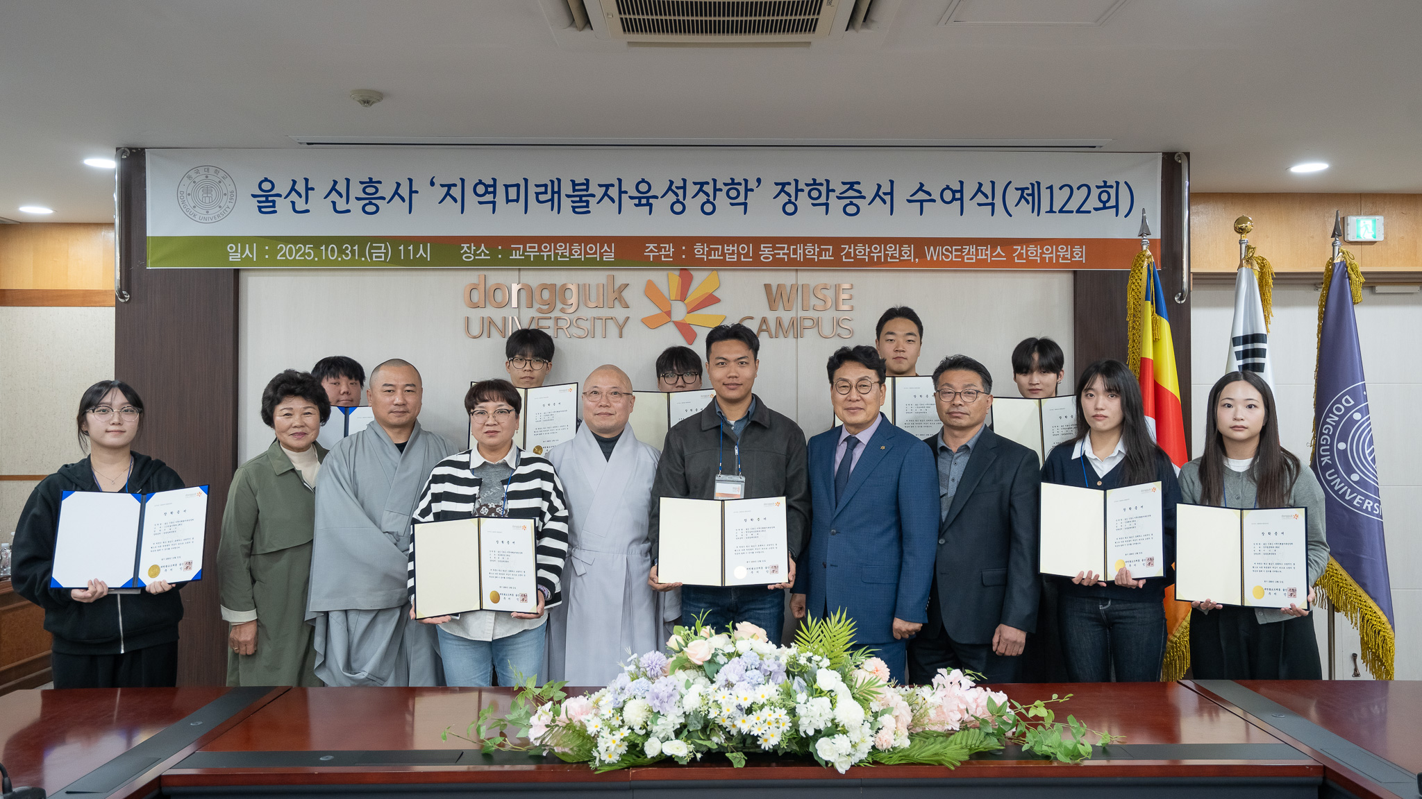 동국대학교 WISE캠퍼스(총장 류완하)는 지난 31일 교내 백주년기념관 교무위원회의실에서 ‘제122회 지역미래불자육성장학’ 장학증서 수여식을 개최했다.