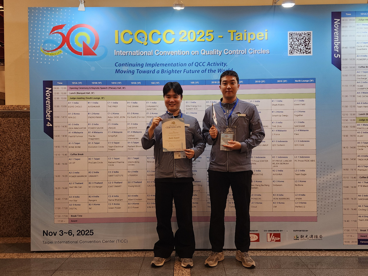 한국수력원자력(이하 한수원) 품질분임조 1개 팀이 지난 3일부터 7일까지 대만 타이베이에서 개최된 ‘2025 국제품질분임조 경진대회(ICQCC)’에 참가해 최고상인 금상을 수상하는 쾌거를 거뒀다.