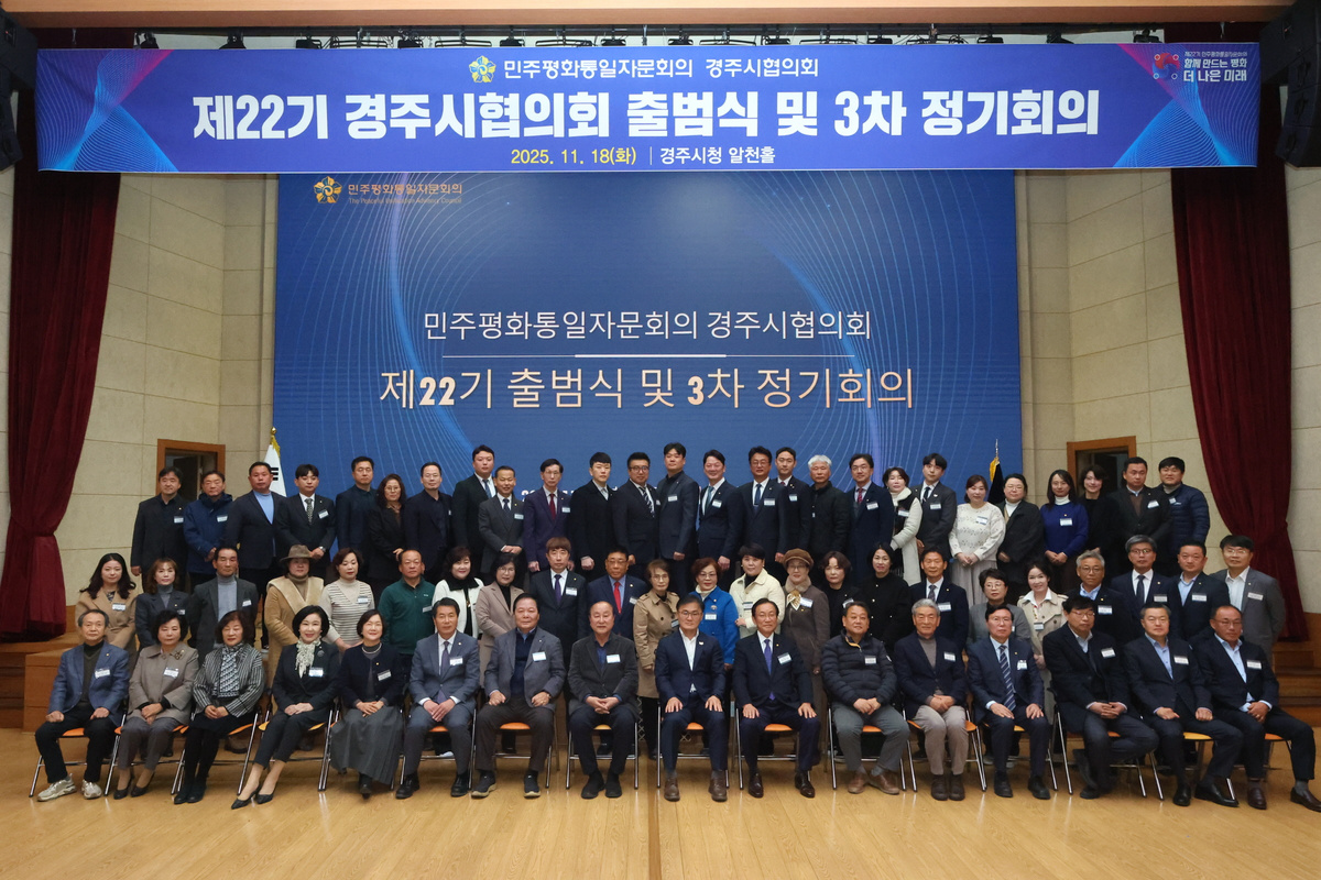 경주시는 지난 18일 시청 알천홀에서 민주평화통일자문회의 경주시협의회(협의회장 장동호)의 ‘제22기 출범식 및 2025년 3차 정기회의’가 송호준 경주시 부시장, 자문위원 등 70여 명이 참석한 가운데 개최됐다고 밝혔다.