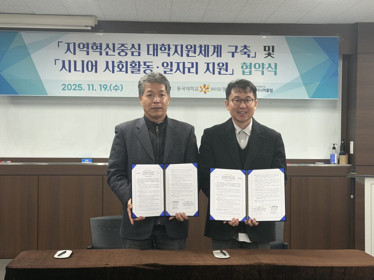 동국대학교 WISE캠퍼스(총장 류완하) 평생교육원(지속가능평생·직업교육사업단, 포용사회혁신교육사업단)과 경주시니어클럽이 지난 19일 지역혁신중심 대학지원체계 구축 및 시니어 사회활동·일자리 지원 강화를 위한 업무협약(MOU)을 체결했다.