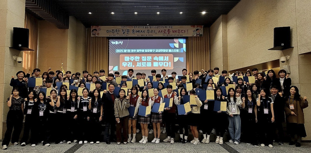 경상북도경주교육지원청(교육장 황영애)은 지난 26일, 경주 황룡원 대연회장에서 「2025년 제1회 경주 중학생 질문·탐구 궁금한마당 페스티벌」을 개최하였다. 이번 행사는 ‘마주한 질문 속에서 우리, 서로를 배우다!’를 주제로, 중학생이 스스로 만든 질문을 바탕으로 탐구·토의하고 결과를 나누는 학생 주도형 수업 축제로 진행되었다.