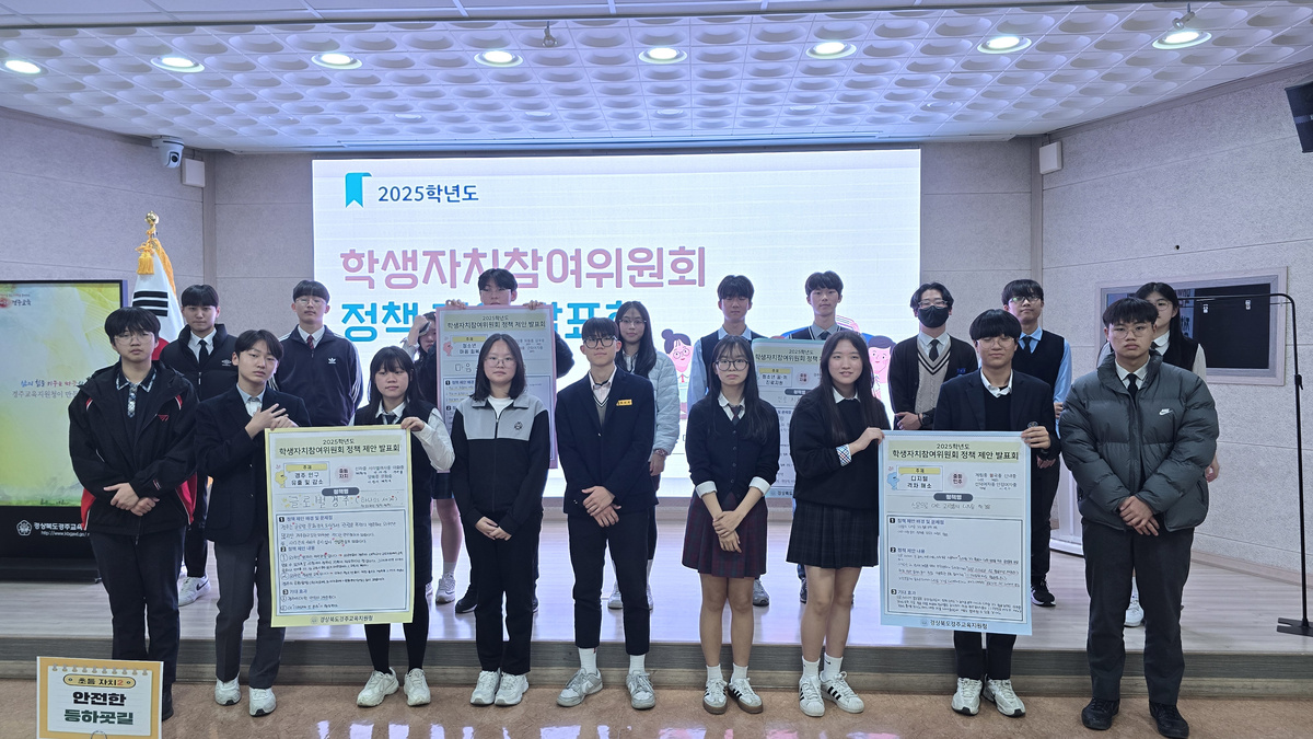 경상북도경주교육지원청(교육장 황영애)은 지난 26일 경주교육지원청 3층 다온실에서 관내 초등학교(6학년) 및 중학교(3학년) 학생회 임원 63명을 대상으로 『2025학년도 학생자치참여위원회 정책 제안 발표회』를 개최했다.