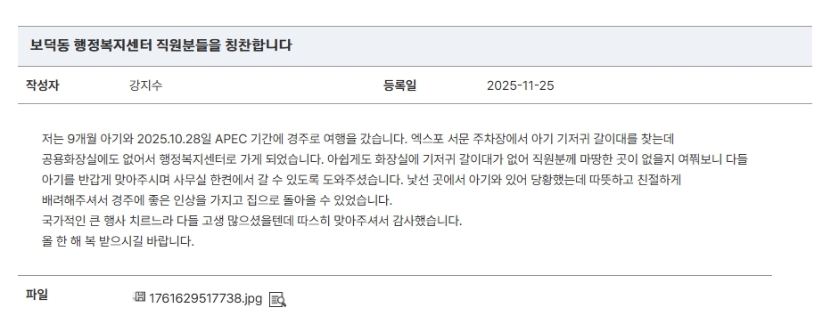 APEC 기간인 10월 28일 경주를 찾은 한 관광객이 아기 기저귀를 갈 곳을 찾지 못하자 보덕동행정복지센터 직원들이 즉각 도움을 준 사실이 뒤늦게 알려져 화제가 되고 있다.