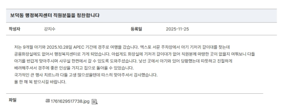 이 사연은 지난달 25일, 아기 엄마 강지수 씨가 경주시 홈페이지 ‘칭찬합시다’ 게시판에 감사 글과 사진을 남기면서 알려졌다.
