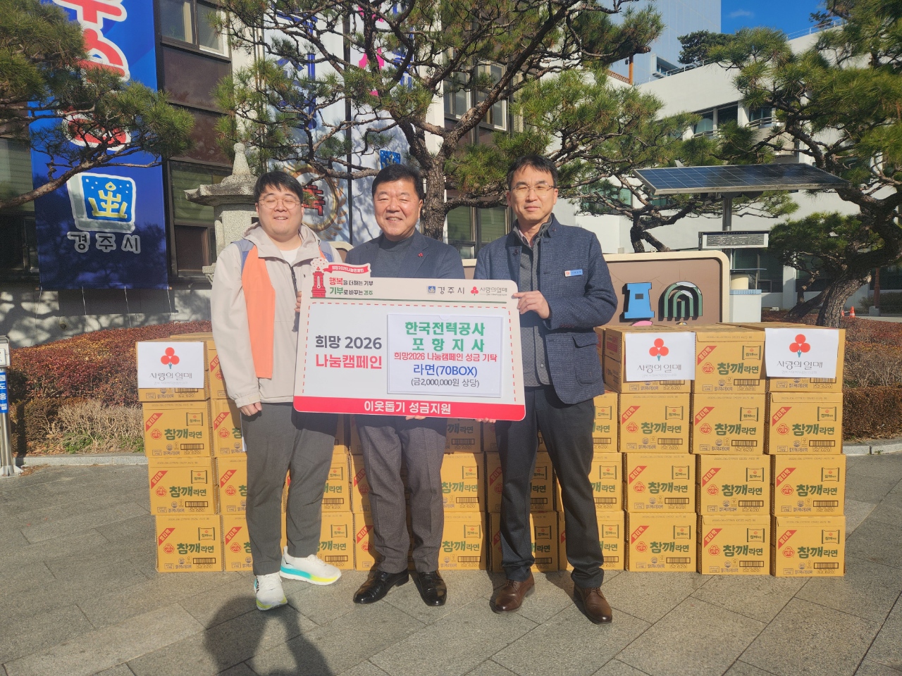 한국전력공사 포항지사는 연말연시를 맞아 지역 내 취약계층을 돕기 위해 라면 70박스(200만 원 상당)를 기부하며 따뜻한 나눔을 실천했다.