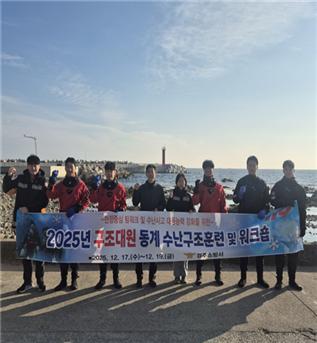 경주소방서는 지난 17일 ~ 19일, 3일간에 걸쳐 포항시 북구 송라면 조사리 인근 해변에서 119구조대원의 수난구조와 장비 조작 숙달 능력 향상 및 팀워크 강화를 위한 ‘2025년 동계 수난구조훈련 및 워크숍’을 실시했다.