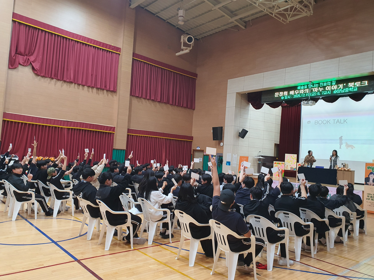 양남중학교는 지난 19일, 학교 강당(꿈누리관)에서 문정희 배우를 초청해 전교생을 대상으로 『마누 이야기』 북 토크를 운영하였다. 이번 행사는 다중지원 학생 성장 프로그램의 일환으로 기획되어, 문정희 배우의 진로 강연과 『마누 이야기』 북 토크를 통해 배우의 삶을 이해하고, 학생 개개인의 삶을 성찰하며 정서적 성장을 지원하는 데 목적을 두었다.