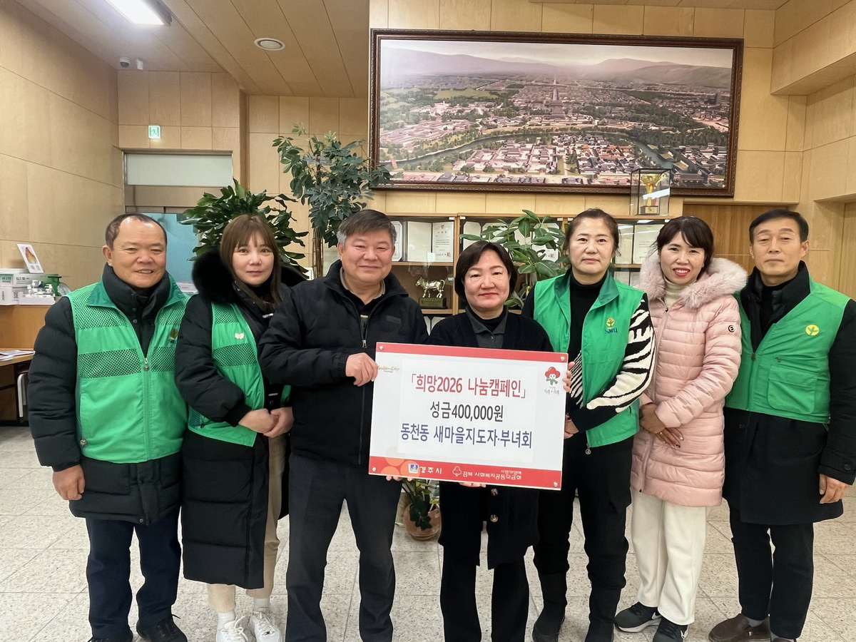 동천동 새마을지도자협의회(회장 이혁봉) 및 새마을부녀회(회장 정혜량)는 지난 26일 동천동 행정복지센터를 방문하여 희망2026 나눔캠페인 성금 40만 원을 전달했다. 새마을지도자협의회와 부녀회는 평소 환경정화 활동, 김장 나눔, 불우이웃 돕기 등 다양한 지역 봉사를 꾸준히 실천하며 따뜻한 공동체 조성에 앞장서고 있다.