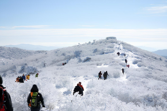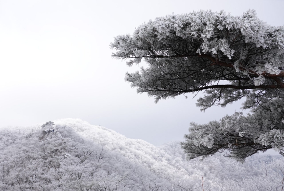 봉화 태백산은 넓게 펼쳐진 능선과 주목 군락 위로 형성되는 상고대 풍경이 장관을 이루는 겨울 명산이다. 완만한 산세와 시원하게 이어지는 능선을 가진 태백산은 겨울이 되면 나무와 풀, 바위 하나하나에 상고대가 맺혀 웅장하면서도 고요한 겨울 풍경을 만들어낸다. 새하얗게 얼어붙은 능선은 끝없이 이어지며 장엄한 분위기를 자아낸다. 태백산의 상고대는 강풍과 짙은 안개가 어우러지는 날 더욱 선명하게 나타나며, 능선을 따라 다양한 겨울 풍경을 선사한다. 특히 천제단과 주요 전망 지점에서는 상고대로 뒤덮인 산 능선과 광활한 겨울 산세를 한눈에 감상할 수 있다.