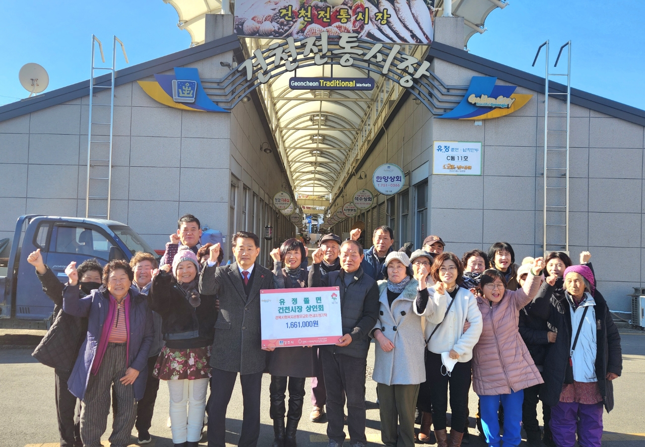 이번 성금은 건천시장 입점 점포인 유정쫄면(대표 전희숙)이 2026년 1월 1일 하루 동안의 매출액 76만원 전액을 기부하고, 여기에 2025년 12월 31일 건천장날을 맞아 시장 상인회 소속 점포와 노점상들이 십시일반 참여해 모은 성금 90만1천원을 더해 마련됐다.