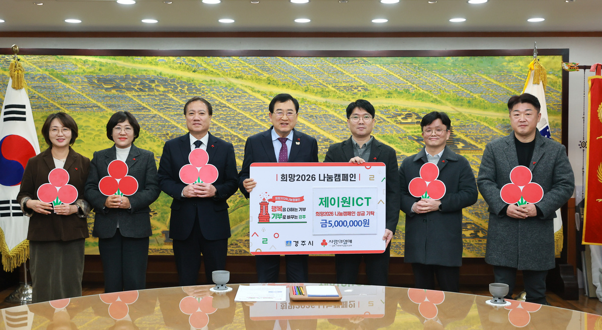경주시는 지난 14일 경주시청에서 ㈜제이원ICT의 희망2026 나눔 캠페인 성금 5백만 원 기탁식을 개최했다. 이날 전달식에는 이재근 대표이사, 신현길 총괄이사, 김성한 기술이사 등 3명이 참석했다.