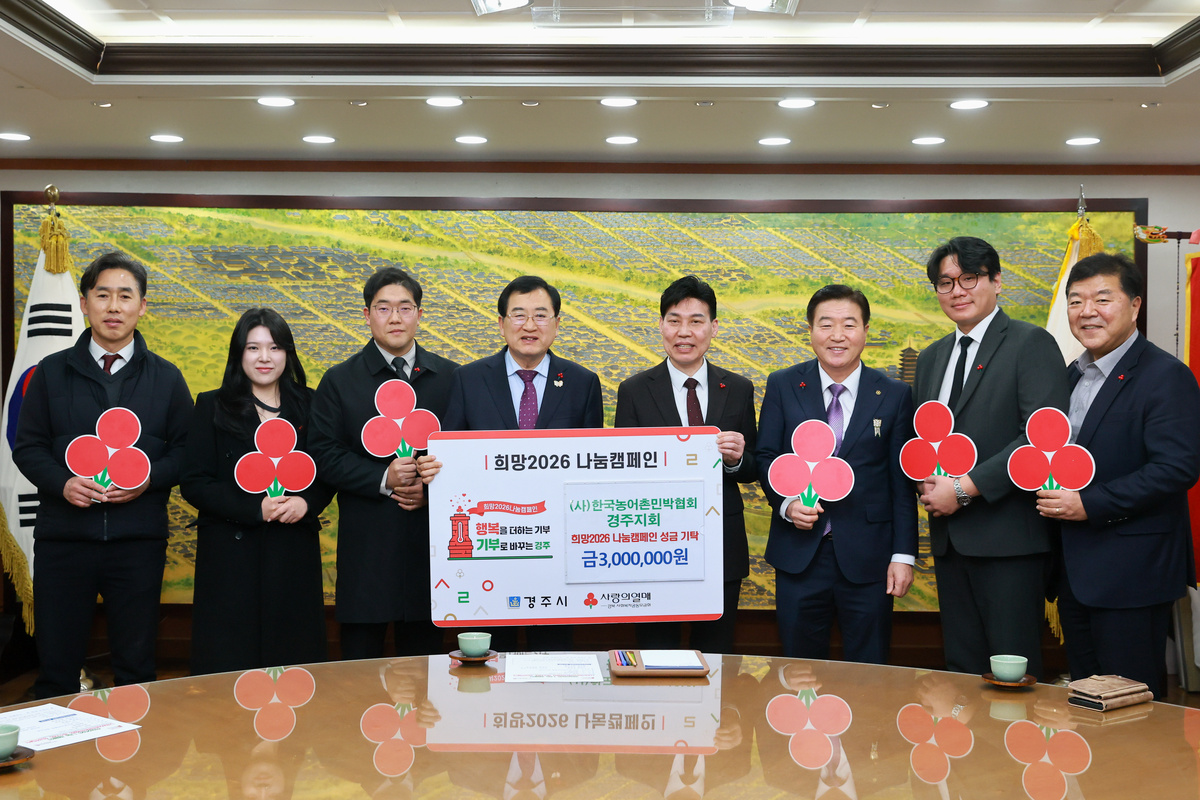 경주시는 지난 14일 시청에서 (사)농어촌민박협회 경주지회(지회장 이태겸)의 희망2026 나눔 캠페인 성금 300만 원 기탁식을 개최했다.