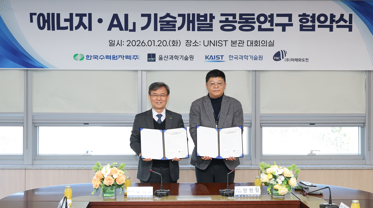 한국수력원자력(이하 한수원)과 울산과학기술원(이하 UNIST) 컨소시엄(참여연구기관: 한국과학기술원(KAIST), ㈜미래와 도전)이 20일 UNIST 본관 대회의실에서 ‘에너지・AI 기술개발 공동연구’ 협약을 체결했다.