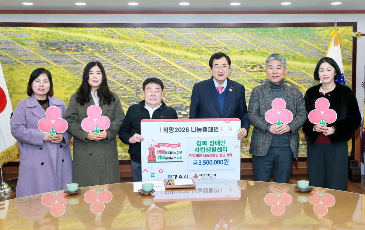경북장애인자립생활센터(대표 박귀룡)는 지난 28일(수) , 경주시청 에서 「희망2026 나눔 캠페인」 성금 전달식을 갖고 성금 350만 원을 기탁했다.