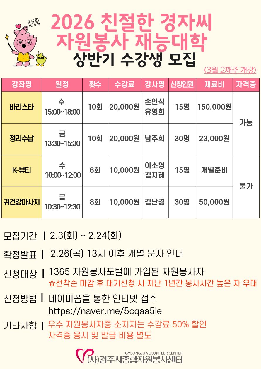 (사)경주시종합자원봉사센터(이사장 정석호, 이하 센터)는 3월부터 6월까지 ‘2026 친절한경자씨 자원봉사 재능대학’(이하 재능대학)을 운영하고, 이에 따른 참여 신청자를 모집한다고 밝혔다.