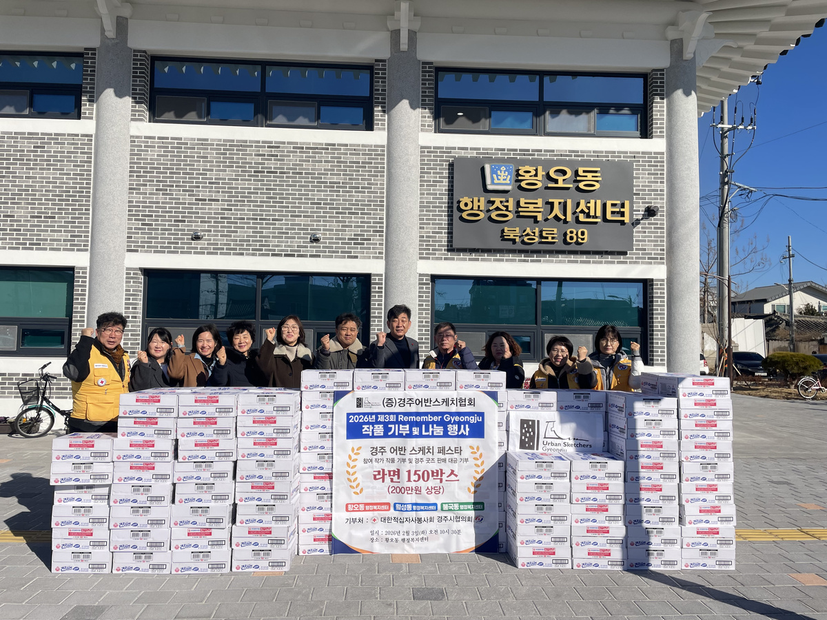 지난 3일(화) 경주어반스케치협회(정동식 회장)은 황오동행정복지센터(동장 김상문)를 찾아 설 명절을 앞두고 지역 내 취약계층을 돕기 위해 라면 50박스를 황오동 행정복지센터에 기탁했다. 이번 기부는 회원들이 자발적으로 뜻을 모아 마련한 것으로, 전달된 라면은 관내 저소득 가구와 도움이 필요한 이웃들에게 배부될 예정이다.
