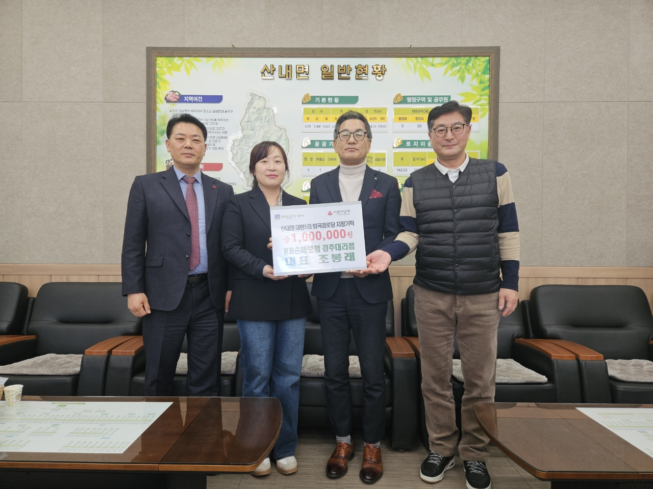 경주시 KB손해보험 경주대리점 조봉래 대표가 지난 9일, 산내면행정복지센터를 방문해 고향인 대현1리 회곡마을 어르신들을 위해 사용해 달라며 성금 100만 원을 기탁했다.