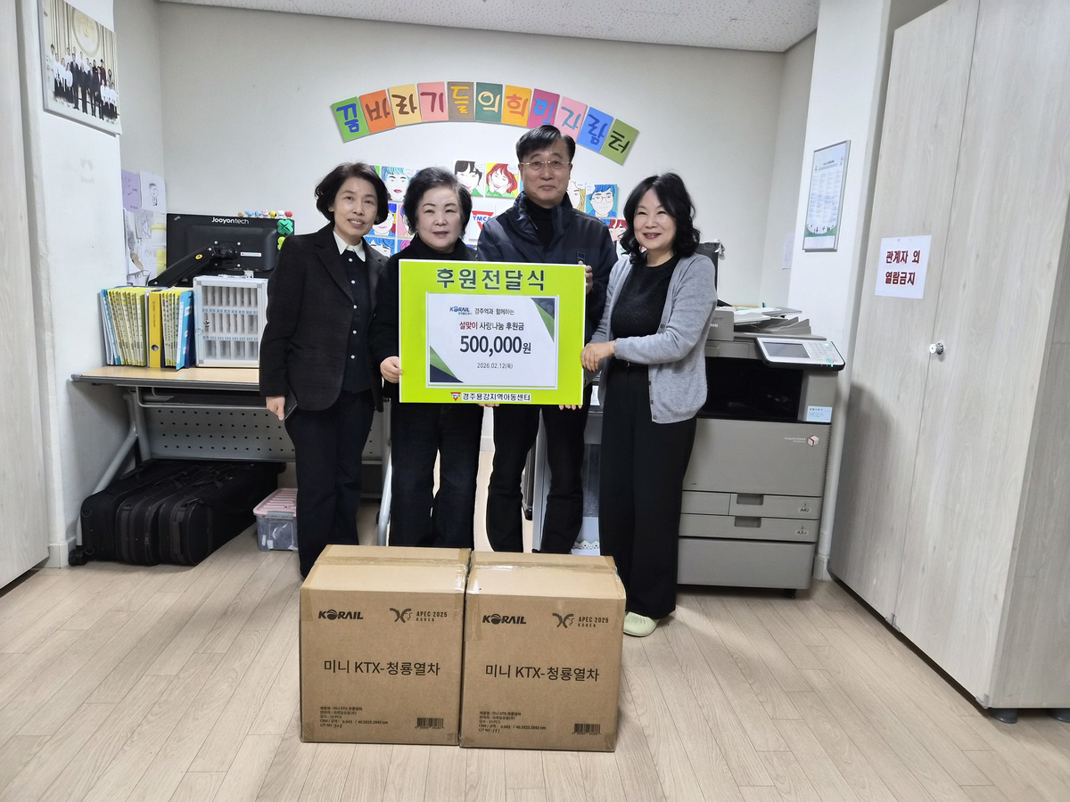 한국철도공사 대구본부 경주역(관리역장 문장수) 새천년봉사회는 지난 12일(목) 경주용강지역아동센터(센터장:박세영)을 찾아 설맞이 사랑나눔 후원금(온누리상품권 50만원)과 미니 KTX-청룡열차 20개를 전달하였다.