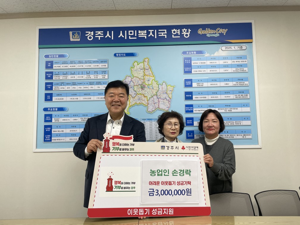 윤철용 시민복지국장은 “어려운 이웃을 위해 따뜻한 나눔을 실천해 주신 손경락 씨께 감사드린다”며 “기탁해 주신 성금은 도움이 필요한 이웃들에게 소중히 전달하겠다”고 전했다.