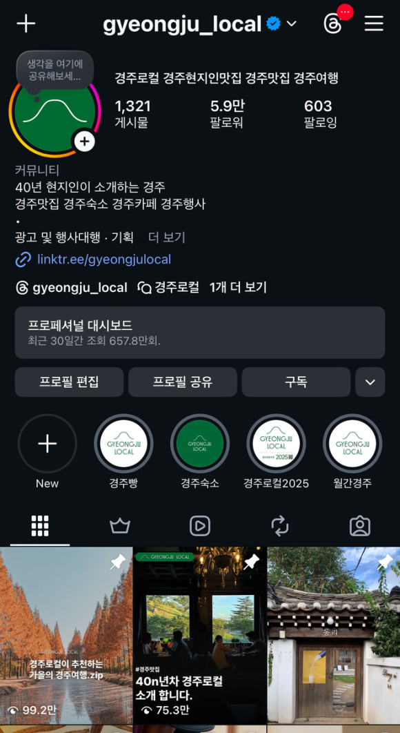 실제 현장에서 바라본 경주 홍보의 현실에 대해 그는 다소 아쉬운 평가를 내놨다. 경주는 대한민국을 대표하는 관광지 가운데 하나지만, 홍보 방식은 여전히 소극적인 편이라는 것이다. 지역민에게 알리는 오프라인 홍보도 물론 중요하지만, 타 지역 관광객을 대상으로 한 온라인 홍보는 상대적으로 취약하다고 진단했다. 특히 SNS 시장에서는 팔로워 숫자만을 보고 홍보 효과를 판단하는 관행이 여전한데, 주제와 맞지 않는 계정이나 이른바 유령 팔로워가 많은 채널에 콘텐츠를 맡기는 경우를 보면 매우 안타깝다고 했다. 김 대표는 제주를 사례로 들며, 현지인의 시선으로 지역 콘텐츠를 소개하는 SNS 채널을 적극적으로 홍보대사로 활용하는 방식이 지역 홍보에 실질적인 도움이 될 수 있다고 강조했다. ‘경주로컬’ 역시 성수기와 비수기에 따라 차이는 있지만 월평균 600만에서 1000만 회 수준의 조회수를 기록하고 있고, 게시물의 99%가 경주와 관련된 콘텐츠인 만큼 지역에 특화된 온라인 채널의 활용 가능성은 충분하다는 설명이다.