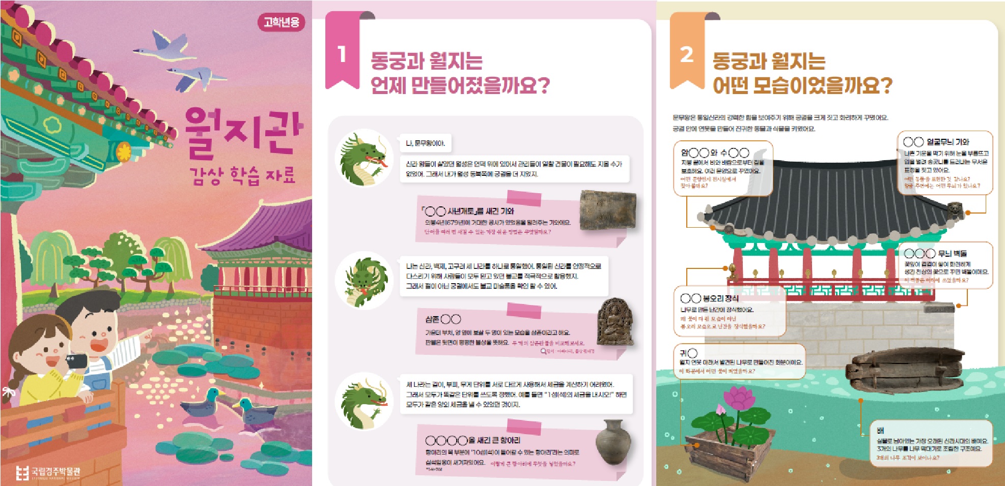 학교 단체를 위해 초등학생 대상 3종, 중·고등학생 대상 1종의 교육 프로그램을 마련하였다. 초등학생을 위한 ‘반짝반짝 신라 금관’과 ‘천년의 울림, 성덕대왕신종’ 프로그램은 평일 오전 10시에 운영되며, 학급 단위(50명 내외)로 참여할 수 있다. 문화유산에 대한 설명과 체험을 통해 금관과 성덕대왕신종의 특징과 의미를 이해할 수 있도록 구성하였다. 이와 함께 새롭게 단장한 월지관 전시의 이해를 돕는 학습자료는 사전 신청을 통해 활동지를 배부받을 수 있으며, 최대 100명까지 신청할 수 있다.