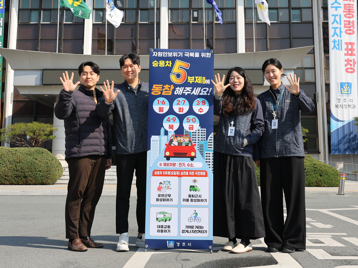 이번 5부제는 차량번호 끝자리 기준 요일별 운행을 제한하는 방식으로, 경주시 공용차 145대와 직원의 10인승 이하 승용자동차 등 공무원 차량과 관용차에 의무 적용된다. 기존 제외 대상이었던 경차와 하이브리드차도 포함해 적용 범위를 확대했다.