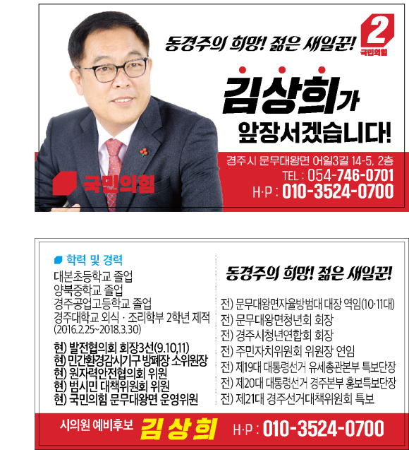 김상희 회장은 “단순한 정치 참여가 아니라 주민들의 준엄한 명령을 받드는 일이라고 생각한다”며 “검증된 추진력과 지역에 대한 깊은 애정을 바탕으로 문무대왕면과 동경주가 경주의 중심축으로 우뚝 설 수 있도록 혼신을 다하겠다”고 전했다.