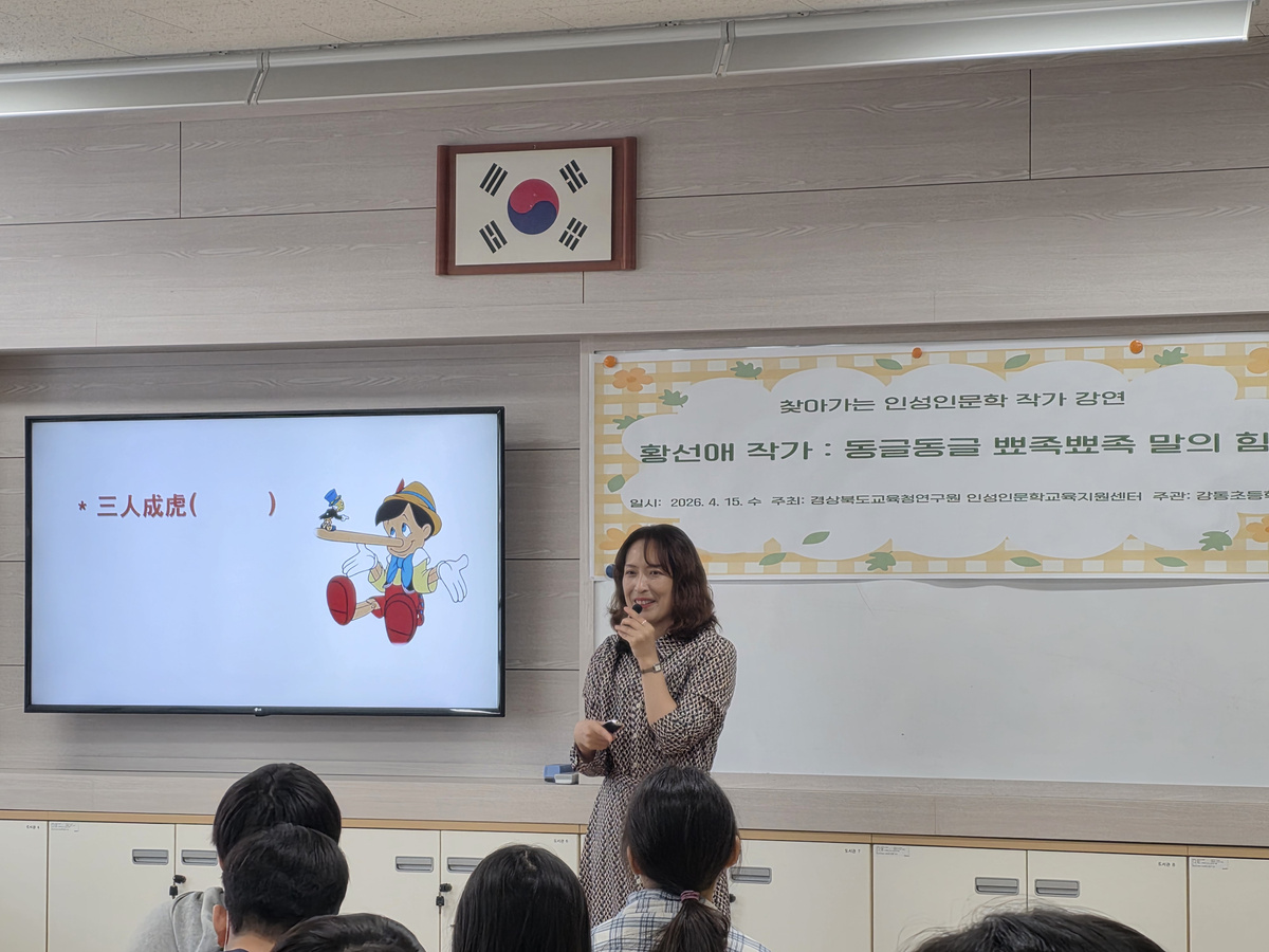 강동초등학교(교장 박영국) 2026년 4월 15일 경상북도교육청연구원이 주최하고 강동초등학교가 주관하는 ‘찾아가는 인성인문학 작가 강연회’를 개최하였다. 3~6학년 학생들을 대상으로 한 ‘오리 부리 이야기’ 동화를 쓴 황선애 작가의 ‘동글동글 뾰족뾰족 말의 힘’이라는 주제의 인성인문학 강연을 통해 학생들의 마음 성장과 문해력 신장을 이끌어 내었다.