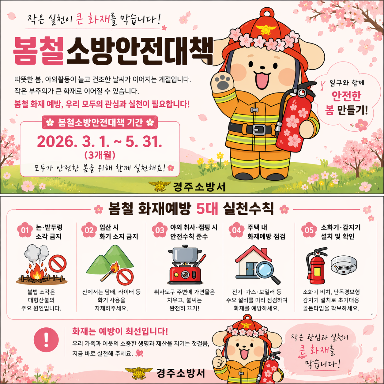 소방서 관계자는 "화재는 예방이 최선이며, 이는 우리 가족과 이웃의 소중한 생명과 재산을 지키는 첫걸음"이라며, "경주시민 여러분의 작은 관심과 실천이 아름다운 경주의 봄을 더욱 안전하게 만들 수 있으니, 이번 소방안전대책에 적극적인 참여와 5대 실천 수칙 준수를 부탁드린다"고 전했다.