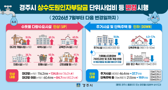 최혁준 경주시장 권한대행은 “이번 조정은 상수도 원인자부담금을 합리적으로 조정한 것”이라며 “수돗물 사용량에 따른 형평성을 높이고 안정적인 상수도 공급 기반을 마련하기 위한 조치”라고 말했다.